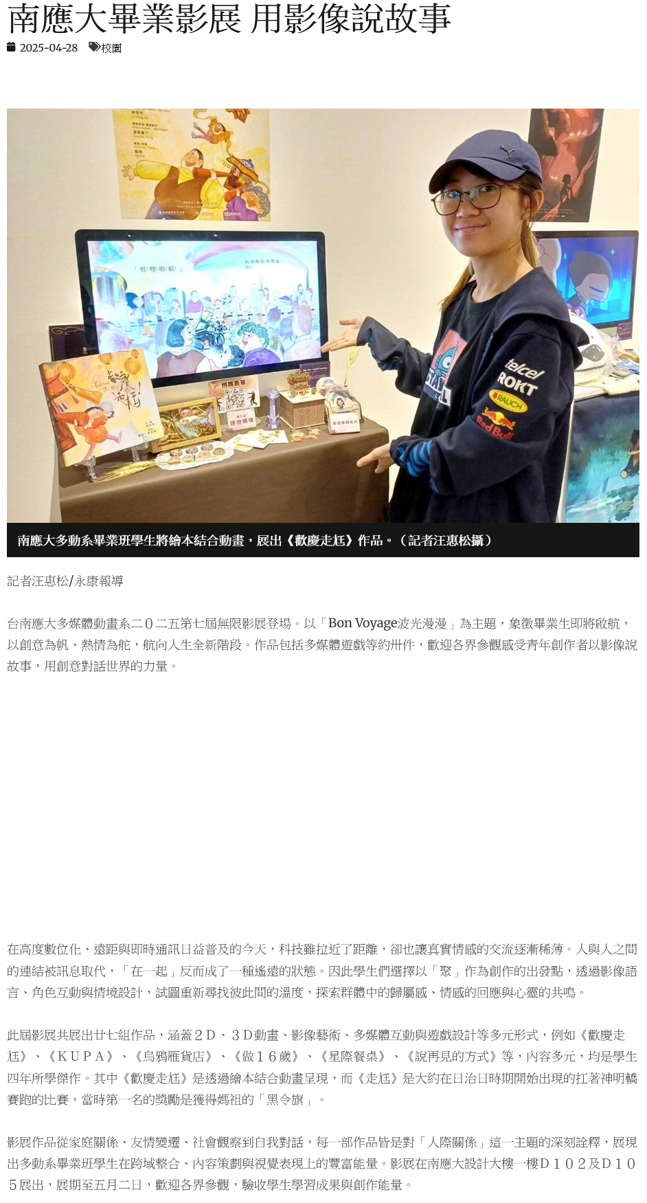 台南應大多媒體動畫系二0二五第七屆無限影展登場。以「Bon Voyage波光漫漫」為主題,象徵畢業生即將啟航,以創意為帆、熱情為舵,航向人生全新階段。作品包括多媒體遊戲等約卅件,歡迎各界參觀感受青年創作者以影像說故事,用創意對話世界的力量。