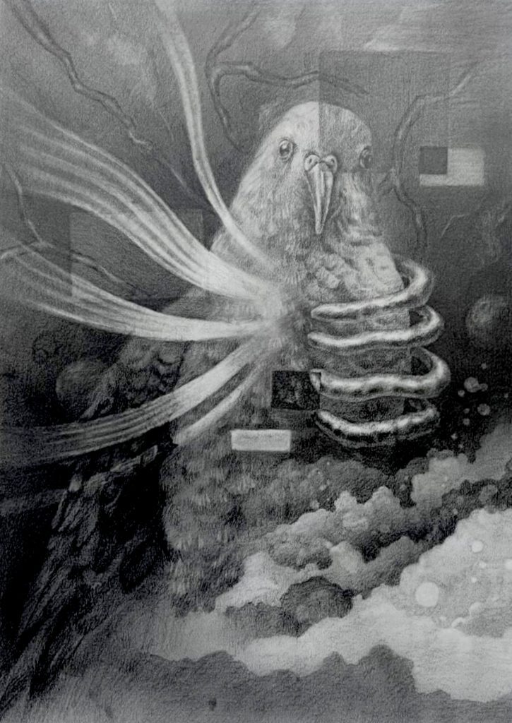 鳥的右側胸口融入肋骨元素,象徵生命的堅韌,而左側胸口散發的光則寓意美好生命的綻放。背景中的血管象徵生命的流動,搭配X光般的元素,營造出生與死亡交錯的氛圍,讓觀者感受到生命的脆弱與永恆。南應大美術系學生在今年國際素描大賽中持續往年的優秀表現,大放異彩。