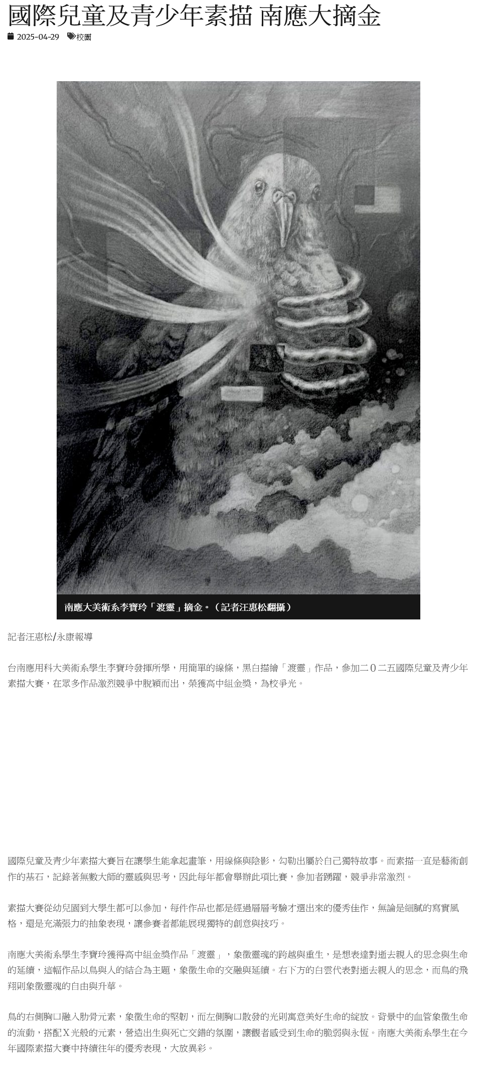 台南應用科大美術系學生李寶玲發揮所學,用簡單的線條,黑白描繪「渡靈」作品,參加二0二五國際兒童及青少年素描大賽,在眾多作品激烈競爭中脫穎而出,榮獲高中組金獎,為校爭光。