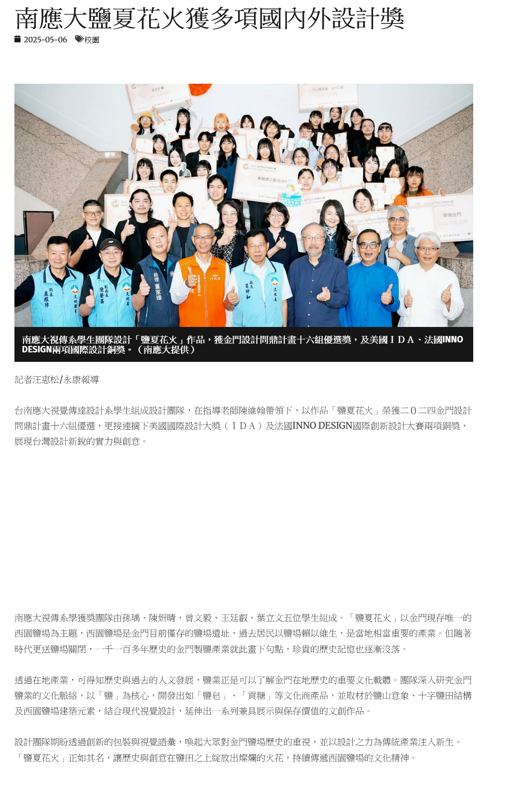 台南應大視覺傳達設計系學生組成設計團隊,在指導老師陳維翰帶領下,以作品「鹽夏花火」榮獲二0二四金門設計問鼎計畫十六組優選,更接連摘下美國國際設計大獎(IDA)及法國INNO DESIGN國際創新設計大賽兩項銅獎,展現台灣設計新銳的實力與創意。