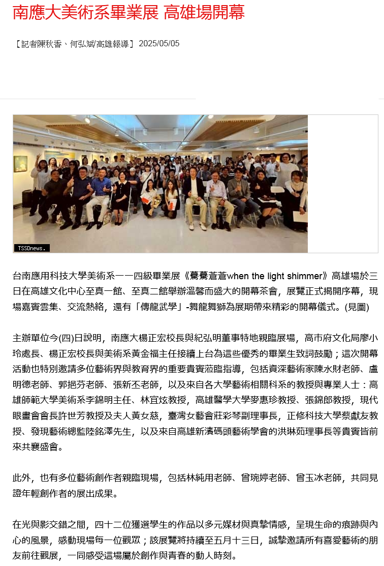主辦單位今(四)日說明,南應大楊正宏校長與紀弘明董事特地親臨展場,高市府文化局廖小玲處長、楊正宏校長與美術系黃金福主任接續上台為這些優秀的畢業生致詞鼓勵;這次開幕活動也特別邀請多位藝術界與教育界的重要貴賓蒞臨指導,包括資深藝術家陳水財老師、盧明德老師、郭挹芬老師、張新丕老師,以及來自各大學藝術相關科系的教授與專業人士:高雄師範大學美術系李錦明主任、林宜炫教授,高雄醫學大學麥惠珍教授、張錦郎教授,現代眼畫會會長許世芳教授及夫人黃女慈,臺灣女藝會莊彩琴副理事長,正修科技大學蔡獻友教授、發現藝術總監陸銘澤先生,以及來自高雄新濱碼頭藝術學會的洪琳茹理事長等貴賓皆前來共襄盛會。