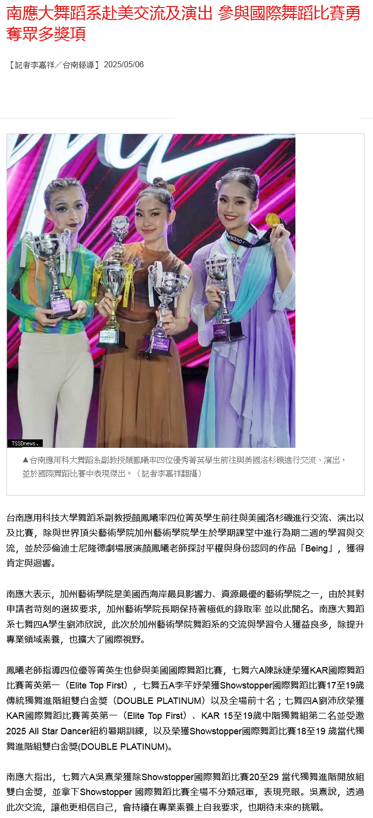 南應大舞蹈系赴美交流及演出 參與國際舞蹈比賽勇奪眾多獎項 【記者李嘉祥報導】https://www.tssdnews.com.tw/?FID=64&CID=803342https://www.taiwantimes.com.tw/app-container/app-content/new/new-content-detail?blogId=blog-ff6ff0a1-aa9a-4169-bcba-1d708e8501bf¤tCategory=101 (台灣時報同刊)https://www.tssdnews.com.tw/?FID=64&CID=803342(台灣新生報同刊)https://www.cdns.com.tw/articles/1221026(中華日報同刊)台南應用科技大學舞蹈系副教授顏鳳曦率四位菁英學生前往與美國洛杉磯進行交流、演出以及比賽,除與世界頂尖藝術學院加州藝術學院學生於學期課堂中進行為期二週的學習與交流,並於莎倫迪士尼隆德劇場展演顏鳳曦老師探討平權與身份認同的作品「Being」,獲得肯定與迴響。南應大表示,加州藝術學院是美國西海岸最具影響力、資源最優的藝術學院之一,由於其對申請者苛刻的選拔要求,加州藝術學院長期保持著極低的錄取率 並以此聞名。南應大舞蹈系七舞四A學生劉沛欣說,此次於加州藝術學院舞蹈系的交流與學習令人獲益良多,除提升專業領域素養,也擴大了國際視野。鳳曦老師指導四位優等菁英生也參與美國國際舞蹈比賽,七舞六A陳詠婕榮獲KAR國際舞蹈比賽菁英第一(Elite Top First),七舞五A李芊妤榮獲Showstopper國際舞蹈比賽17至19歲傳統獨舞進階組雙白金獎(DOUBLE PLATINUM)以及全場前十名;七舞四A劉沛欣榮獲KAR國際舞蹈比賽菁英第一(Elite Top First)、KAR 15至19歲中階獨舞組第二名並受邀2025 All Star Dancer紐約暑期訓練,以及榮獲Showstopper國際舞蹈比賽18至19 歲當代獨舞進階組雙白金獎(DOUBLE PLATINUM)。南應大指出,七舞六A吳熹榮獲除Showstopper國際舞蹈比賽20至29 當代獨舞進階開放組雙白金獎,並拿下Showstopper 國際舞蹈比賽全場