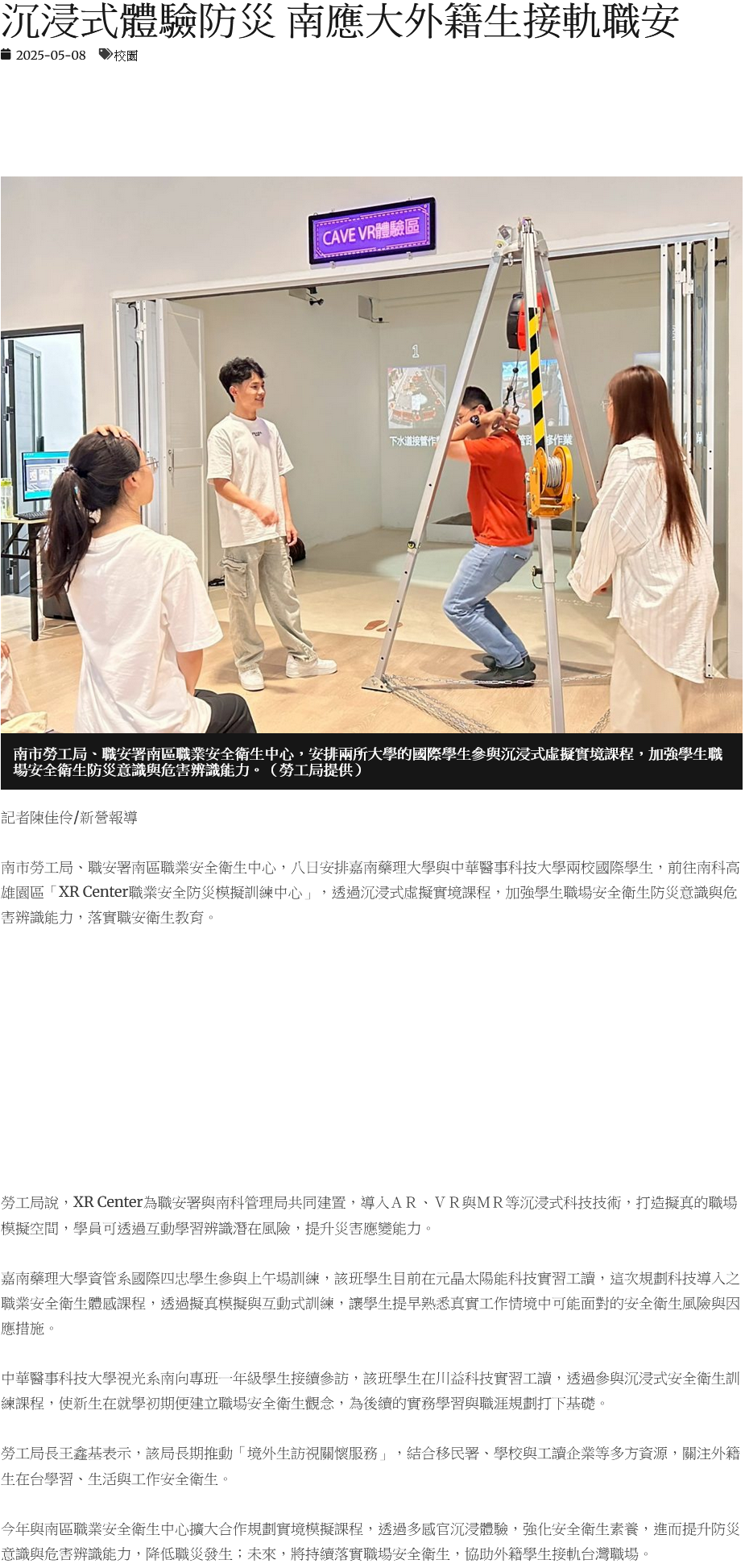 南市勞工局、職安署南區職業安全衛生中心,八日安排嘉南藥理大學與中華醫事科技大學兩校國際學生,前往南科高雄園區「XR Center職業安全防災模擬訓練中心」,透過沉浸式虛擬實境課程,加強學生職場安全衛生防災意識與危害辨識能力,落實職安衛生教育。