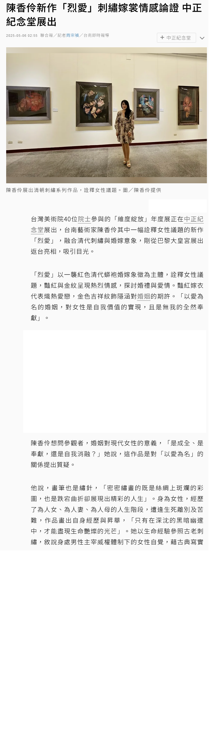 陳香伶新作「烈愛」刺繡嫁裳情感論證 中正紀念堂展出