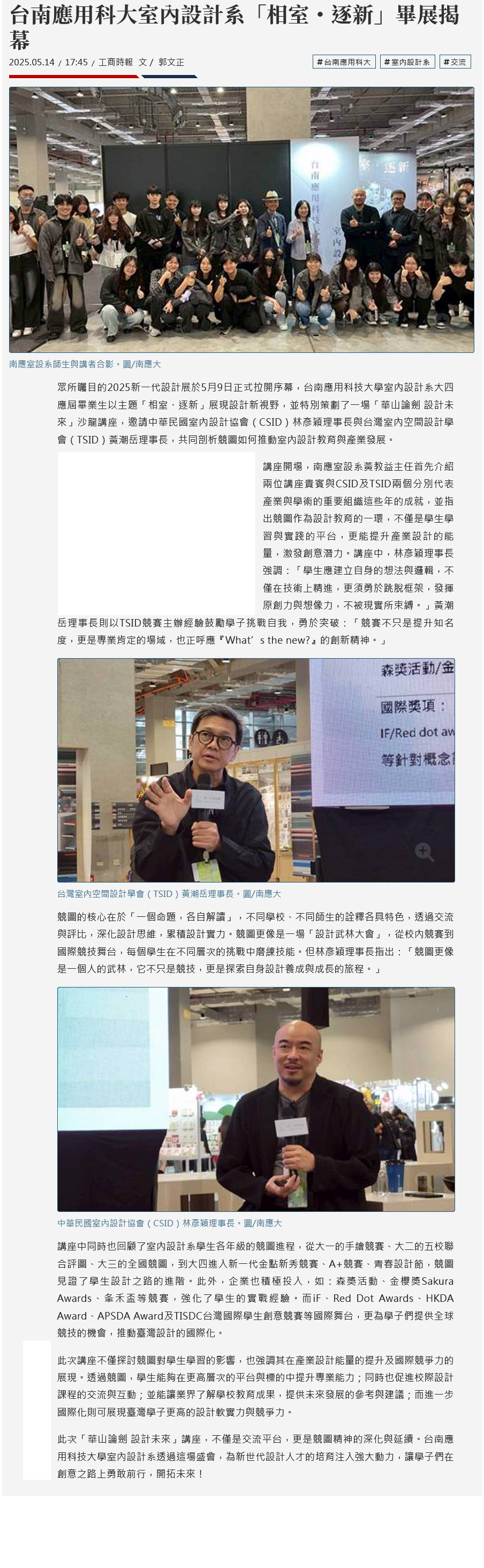 講座中同時也回顧了室內設計系學生各年級的競圖進程,從大一的手繪競賽、大二的五校聯合評圖、大三的全國競圖,到大四進入新一代金點新秀競賽、A+競賽、青春設計節,競圖見證了學生設計之路的進階。此外,企業也積極投入,如:森獎活動、金櫻獎Sakura Awards、夆禾盃等競賽,強化了學生的實戰經驗。而iF、Red Dot Awards、HKDA Award、APSDA Award及TISDC台灣國際學生創意競賽等國際舞台,更為學子們提供全球競技的機會,推動臺灣設計的國際化。