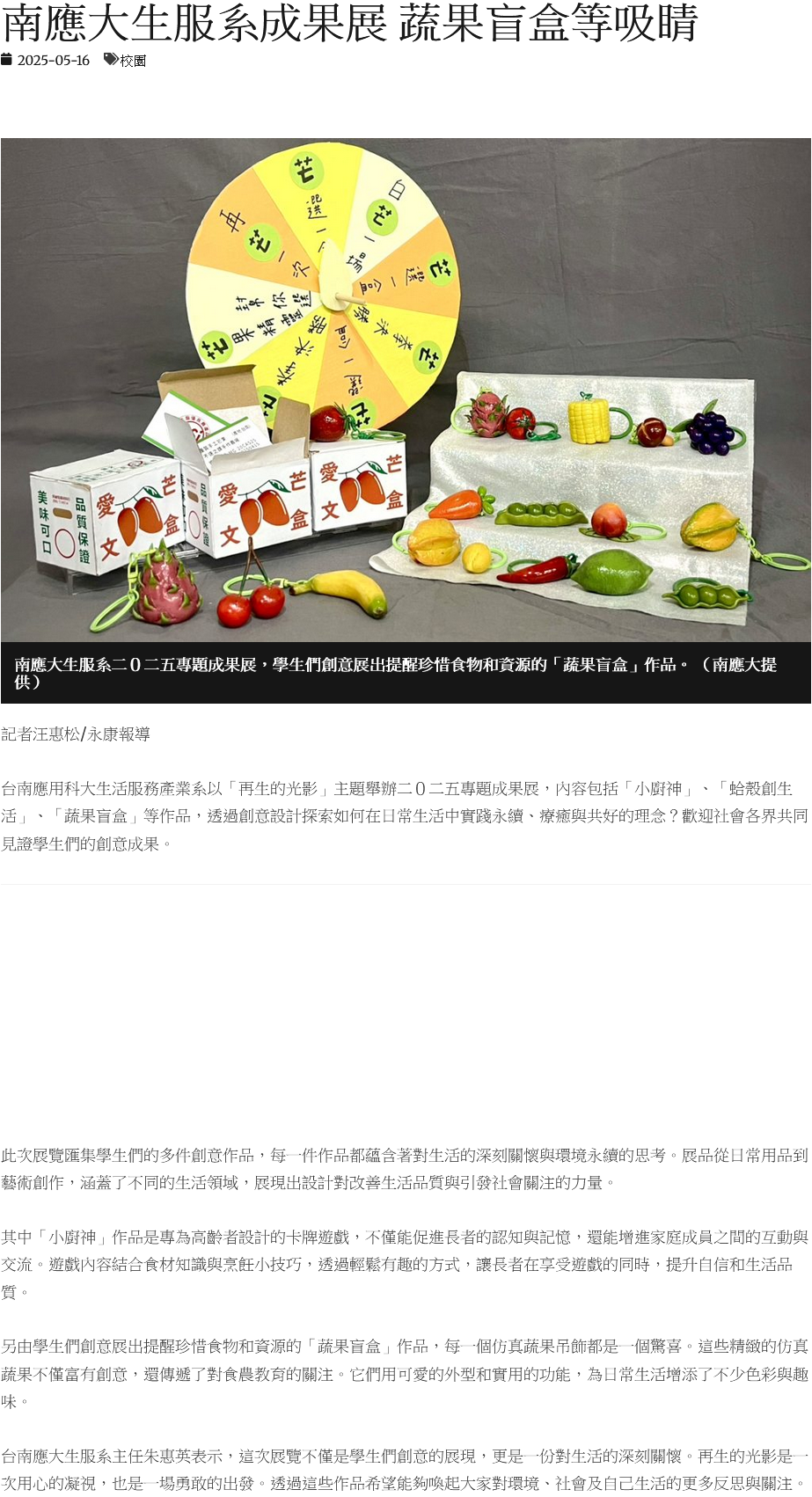 台南應用科大生活服務產業系以「再生的光影」主題舉辦二0二五專題成果展,內容包括「小廚神」、「蛤殼創生活」、「蔬果盲盒」等作品,透過創意設計探索如何在日常生活中實踐永續、療癒與共好的理念?歡迎社會各界共同見證學生們的創意成果。