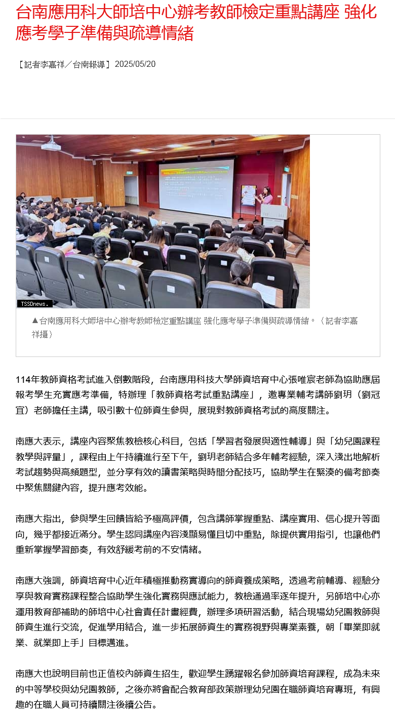 114年教師資格考試進入倒數階段,台南應用科技大學師資培育中心張唯宸老師為協助應屆報考學生充實應考準備,特辦理「教師資格考試重點講座」,邀專業輔考講師劉玥(劉冠宜)老師擔任主講,吸引數十位師資生參與,展現對教師資格考試的高度關注。