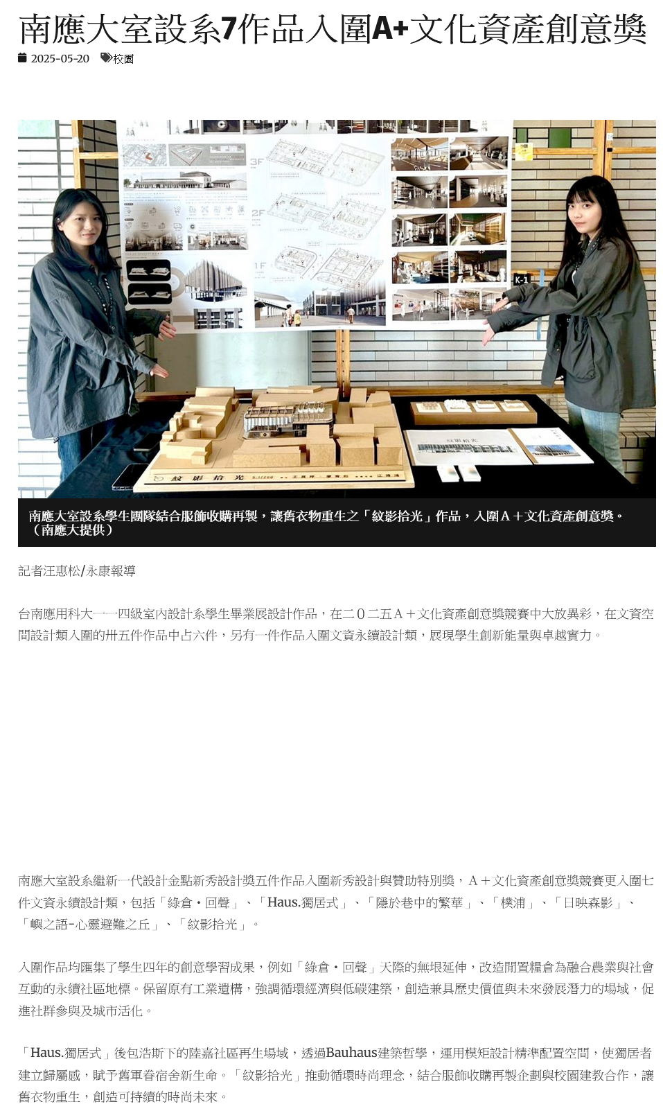 南應大室設系繼新一代設計金點新秀設計獎五件作品入圍新秀設計與贊助特別獎,A+文化資產創意獎競賽更入圍七件文資永續設計類,包括「綠倉•回聲」、「Haus.獨居式」、「隱於巷中的繁華」、「樸浦」、「日映森影」、「嶼之語-心靈避難之丘」、「紋影拾光」。