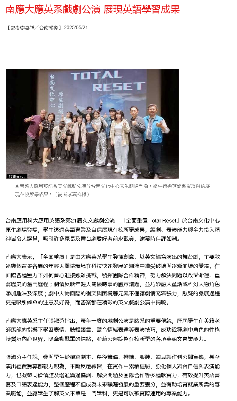 台南應用科大應用英語系第21屆英文戲劇公演-「全面重置 Total Reset」於台南文化中心原生劇場登場,學生透過英語專業及自信展現在校所學成果,編劇、表演能力與全力投入精神皆令人讚賞,吸引許多家長及舞台劇愛好者前來觀賞,謝幕時佳評如潮。