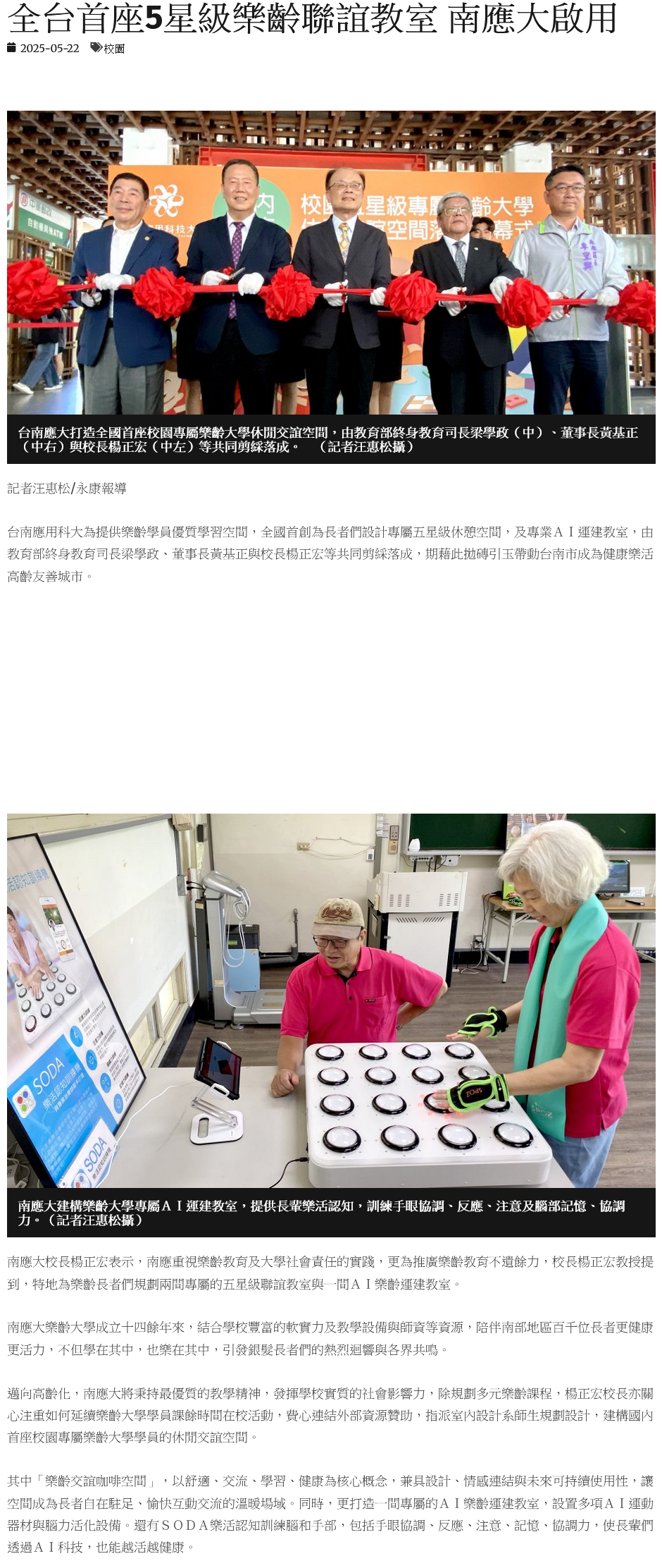 全台首座5星級樂齡聯誼教室 南應大啟用 【記者汪惠松/永康報導】https://www.cdns.com.tw/articles/1222920https://www.ctee.com.tw/news/20250523700359-439901(工商時報同刊)https://www.epochtimes.com/b5/25/5/22/n14515493.htm(大紀元同刊)https://news.ltn.com.tw/news/life/breakingnews/5051714(自由時報同刊)https://www.tssdnews.com.tw/?FID=64&CID=806538(台灣新生報)https://udn.com/news/story/6928/8760769(聯合新聞報同刊) 台南應用科大為提供樂齡學員優質學習空間,全國首創為長者們設計專屬五星級休憩空間,及專業AI運建教室,由教育部終身教育司長梁學政、董事長黃基正與校長楊正宏等共同剪綵落成,期藉此拋磚引玉帶動台南市成為健康樂活高齡友善城市。 南應大校長楊正宏表示,南應重視樂齡教育及大學社會責任的實踐,更為推廣樂齡教育不遺餘力,校長楊正宏教授提到,特地為樂齡長者們規劃兩間專屬的五星級聯誼教室與一間AI樂齡運建教室。 南應大樂齡大學成立十四餘年來,結合學校豐富的軟實力及教學設備與師資等資源,陪伴南部地區百千位長者更健康更活力,不但學在其中,也樂在其中,引發銀髮長者們的熱烈迴響與各界共鳴。 邁向高齡化,南應大將秉持最優質的教學精神,發揮學校實質的社會影響力,除規劃多元樂齡課程,楊正宏校長亦關心注重如何延續樂齡大學學員課餘時間在校活動,費心連結外部資源贊助,指派室內設計系師生規劃設計,建構國內首座校園專屬樂齡大學學員的休閒交誼空間。 其中「樂齡交誼咖啡空間」,以舒適、交流、學習、健康為核心概念,兼具設計、情感連結與未來可持續使用性,讓空間成為長者自在駐足、愉快互動交流的溫暖場域。同時,更打造一間專屬的AI樂齡運建教室,設置多項AI運動器材與腦力活化設備。還有SODA樂活認知訓練腦和手部,包括手眼協調、反應、注意、記憶、協調力,使長輩們透過AI科技,也能越活越健康。