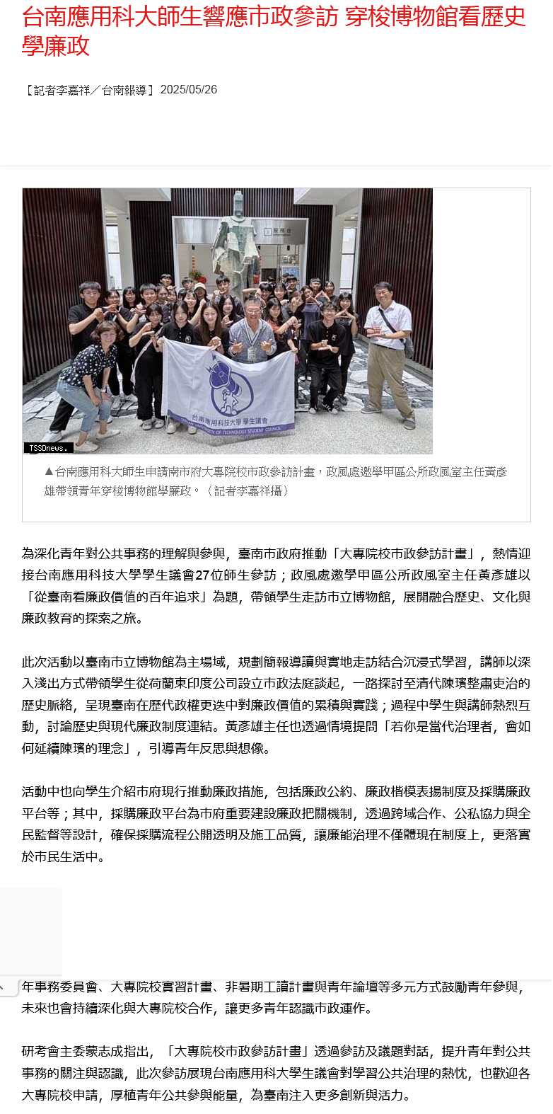 為深化青年對公共事務的理解與參與,臺南市政府推動「大專院校市政參訪計畫」,熱情迎接台南應用科技大學學生議會27位師生參訪;政風處邀學甲區公所政風室主任黃彥雄以「從臺南看廉政價值的百年追求」為題,帶領學生走訪市立博物館,展開融合歷史、文化與廉政教育的探索之旅。