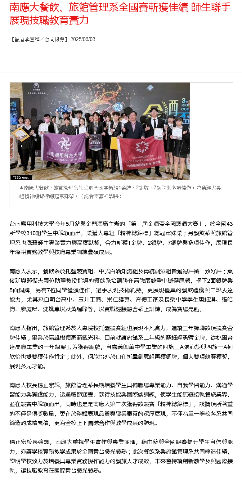 南應大表示,餐飲系於托盤競賽組、中式白酒知識組及傳統調酒組皆獲得評審一致好評;葉俊廷與鄭傑夫兩位助理教授指導的餐飲系培訓隊在高強度競爭中穩健應戰,摘下2面銀牌與5面銅牌,另有7位同學獲頒佳作,選手表現技術純熟,更展現優異的餐飲禮儀與口說表達能力,尤其來自明台高中、玉井工商、崇仁護專、育德工家及長榮中學學生唐鈺淇、張皓鈞、廖庭暐、沈姵薰以及黃瑞聆等,以實戰經驗融合系上訓練,成為賽場亮點。