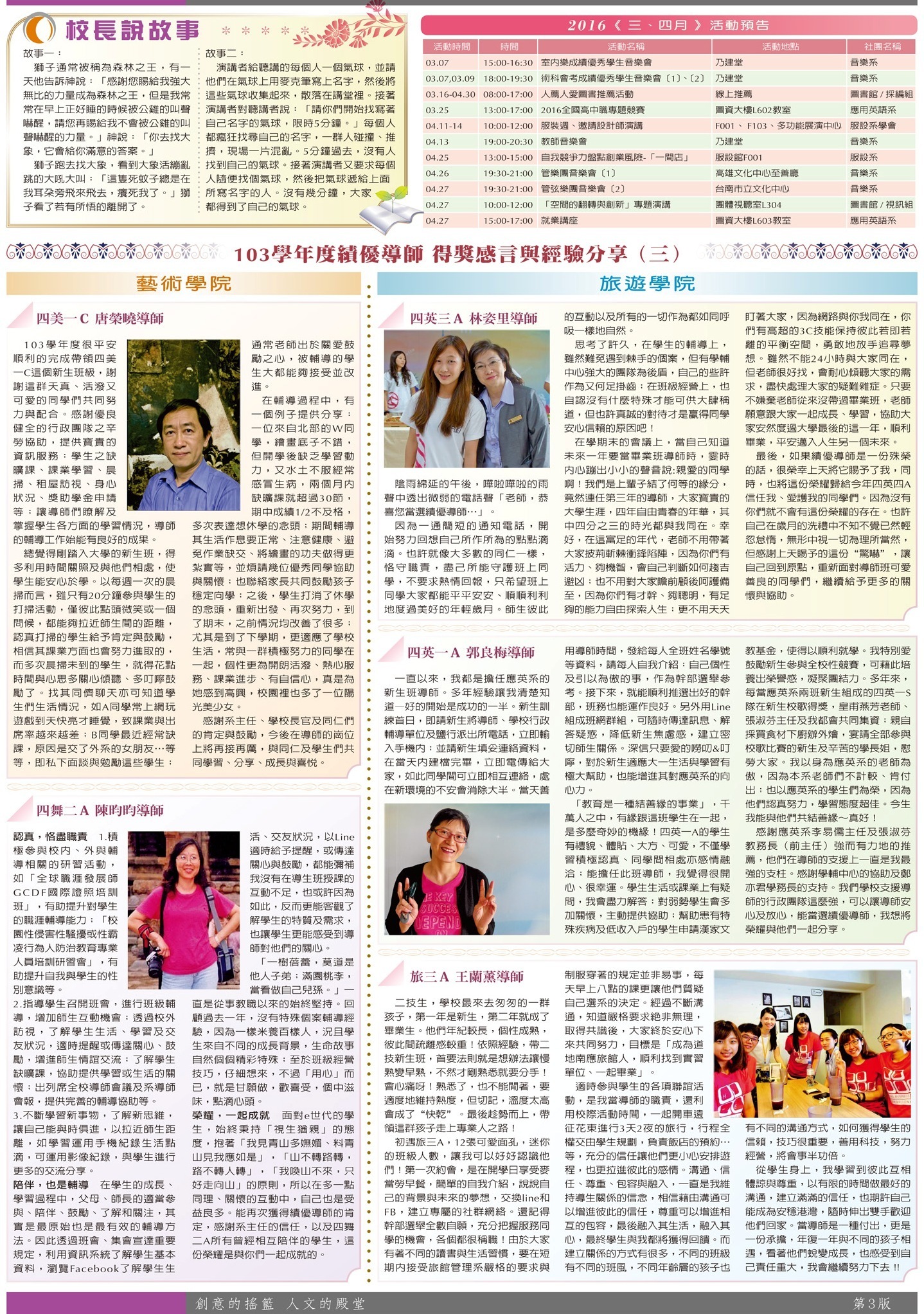 校園報導 校長說故事•活動預告•績優導師感言與分享(三)