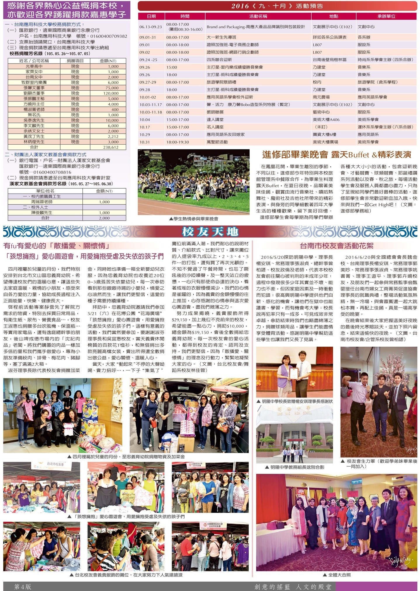 綜合訊息 捐贈芳名錄•活動預告•進修部畢業晚會•校友天地