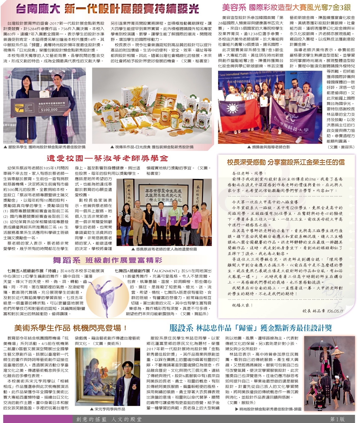校園焦點 獲獎榮耀•蔡老師遺愛校園•校長感動分享•系報導