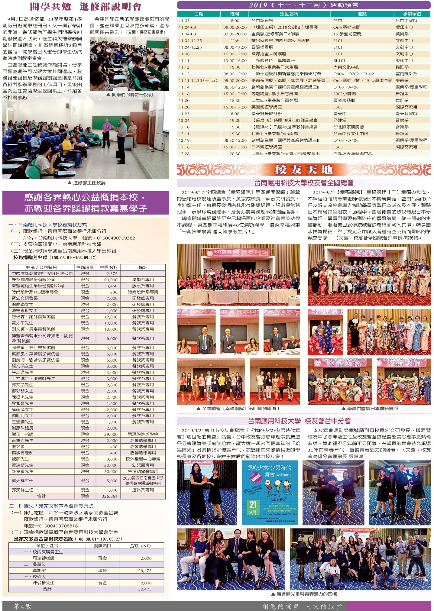 綜合訊息 進修部專欄•活動預告•捐贈芳名錄•校友天地
